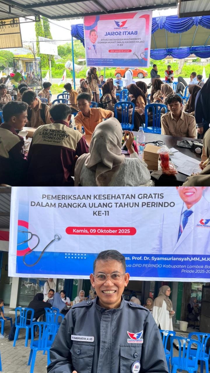 Lombok Barat, Mediajurnalindonesia.id- Dalam rangka memperingati Hari Ulang Tahun (HUT) ke-11 Partai Persatuan Indonesia (Perindo), Dewan Pimpinan Daerah (DPD) II Partai Perindo Kabupaten Lombok Barat menggelar kegiatan sosial berupa pemeriksaan kesehatan gratis bagi masyarakat. Acara tersebut berlangsung pada Kamis pagi (9/10/2025), mulai pukul 08.00 hingga 12.00 WITA, dan disambut antusias oleh ratusan warga.
