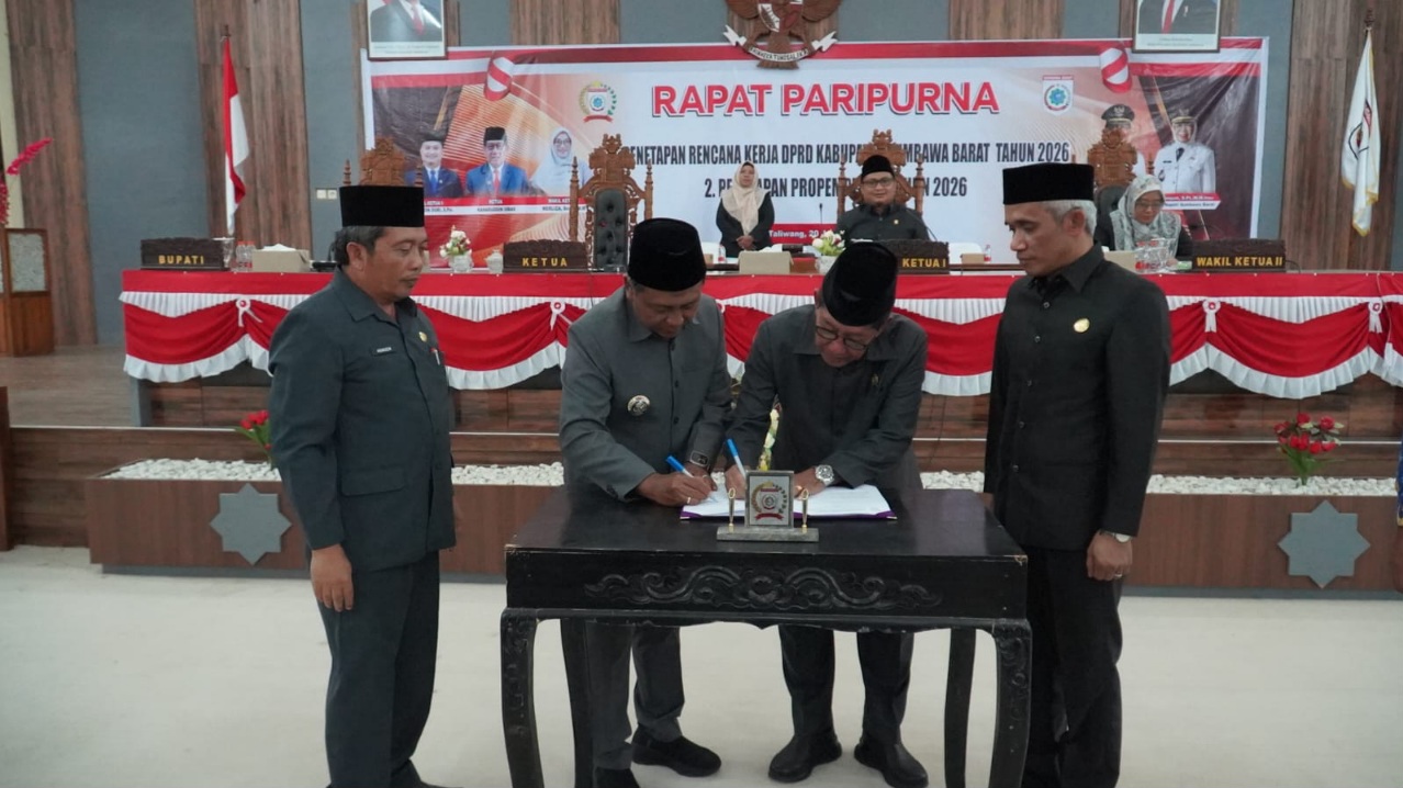 Dewan Perwakilan Rakyat Daerah (DPRD) Kabupaten Sumbawa Barat (KSB) menggelar Rapat Paripurna dengan agenda penetapan Rencana Kerja DPRD Tahun 2026 serta penandatanganan Kesepakatan Bersama Program Pembentukan Peraturan Daerah (Propemperda) Tahun 2026, Selasa (20/1/2026).