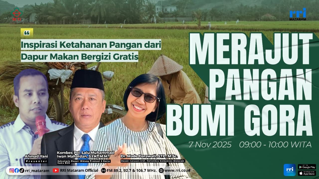 Mataram.mediajurnalindonesia.id.Program ketahanan pangan bukan lagi sekadar jargon pemerintah. Dalam dialog interaktif Merajut Pangan Bumi Gora yang tayang di RRI Mataram, Jumat (7/11/2025), Sekretarid Deputi (Sesdep) Promosi dan Kerja Sama Badan Gizi Nasional (BGN) RI, Kombes Pol. Lalu Muhammad Iwan Mahardan, S.I.K., M.M., memaparkan bagaimana dapur makan bergizi gratis (MBG), dapat menjadi “mesin perubahan” untuk kualitas SDM Indonesia.