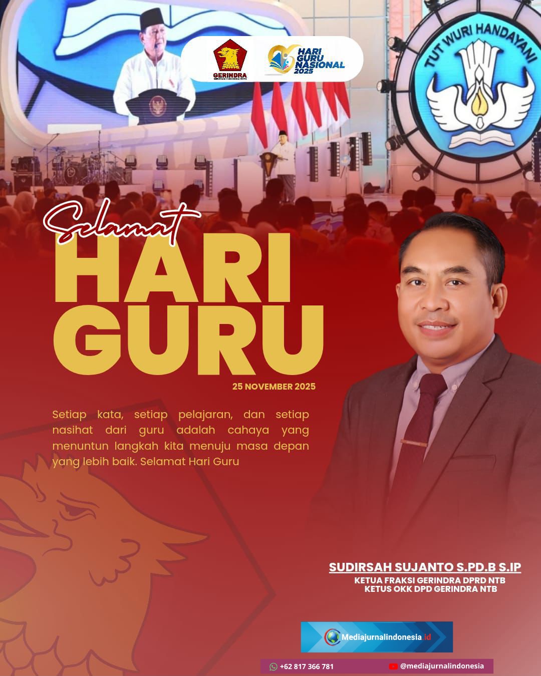 Lombok Utara, Mediajurnalindonesia.id – Ketua Fraksi Gerindra DPRD Nusa Tenggara Barat (NTB), Sudirsah Sujanto, S.Pd.B., S.IP, mengucapkan Selamat Hari Guru Nasional dan menyampaikan apresiasinya terhadap peran guru bertepatan dengan peringatan Hari Guru Nasional yang jatuh pada 25 November 2025.
